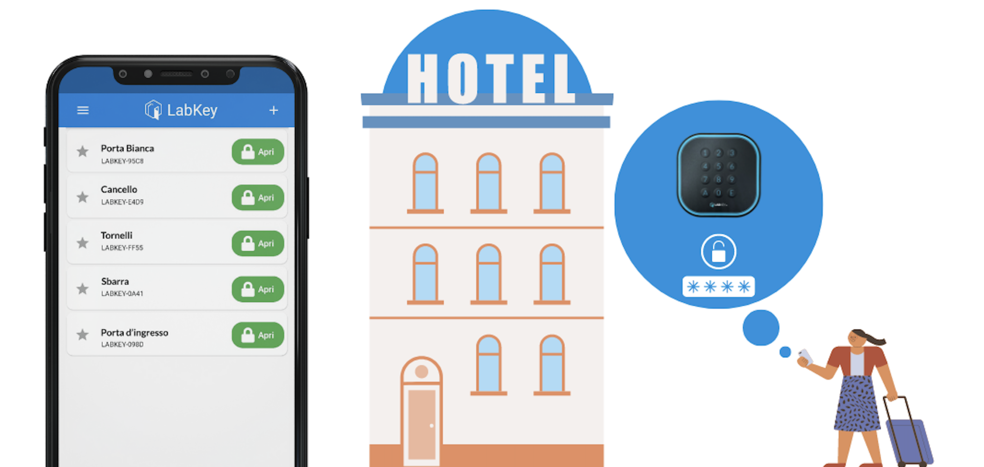 Un sistema innovativo come LabKey, che può interfacciarsi con serrature elettriche con una semplice installazione, permette l’apertura di porte, cancelli, tornelli (qualsiasi varco elettrificato) tramite smartphone.