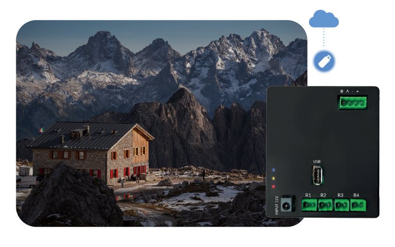 La centralina richiede un’alimentazione a 12V e si connette al cloud tramite Dongle USB con SIM integrata.