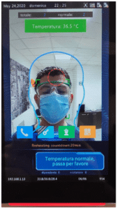 Controllo temperatura e mascherina individuale. Controlla la temperatura e mascherina di una persona per volta. Per la rilevazione corretta l’individuo deve essere posizionato di fronte al termometro. Se non ci sono anomalie la termo camera da l’ok al controllo accessi che permette l’accesso ai locali. La precisione del termometro è di 0,2 °C. E’ importante sottolineare che se messo all’esterno deve essere riparato dal sole per una corretta misurazione. Il termo scanner tablet non è adatto alla misurazione in ambienti esterni.