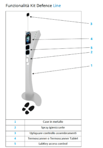 Defence Line per la registrazione, segnalazione e alerting delle presenze in ambienti privati e pubblici. Il kit Defence Line consente di effettuare controlli di screening per il Coronavirus, attraverso una verifica della temperatura corporea SENZA CONTATTO che effettua la misura in sicurezza, senza infettare lo strumento di misura. Oltre ai termometri a infrarosso, per misurare la temperatura è possibile utilizzare dei termoscanner, che discrimina anche gli utenti che devono avere eventuali mascherine. Il kit di base è dotato di un nebulizzatore automatico di liquido disinfettante per le mani.