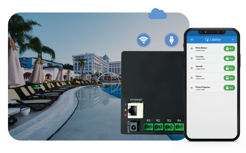 For access control of up to 4 gates via remote opening with cloud management and connection via Wi-Fi or LAN cable.
